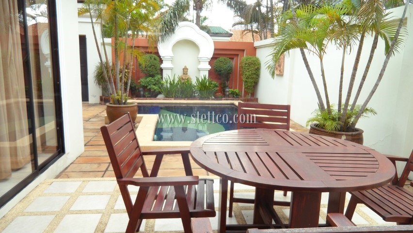 It features an adorably arranged and landscaped tropical garden, which is easy to maintain, an attractive swimming pool, and a pleasant terrace. The villa is fully furnished and decorated presenting a pretty bedroom with teak wood built-in furniture, a well-sized bathroom with a Romain bath, a living room with a decent sitting group, a bistro-type dining table, and all contemporary entertainment equipment.