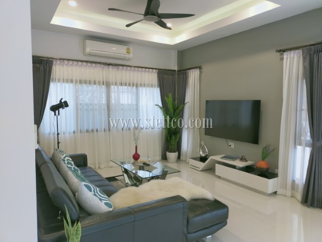 This charming pool villa sits on a plot of 312 square meters and features a total living area of approximately 154 square meters. The villa is throughout tastefully furnished and decorated. Has a large living area, a dining table for 6, and large modern european kitchen. There are two decently furnisherd and decorated bedrooms. The new owner may easily convert this villa into a 3 bedrooms.